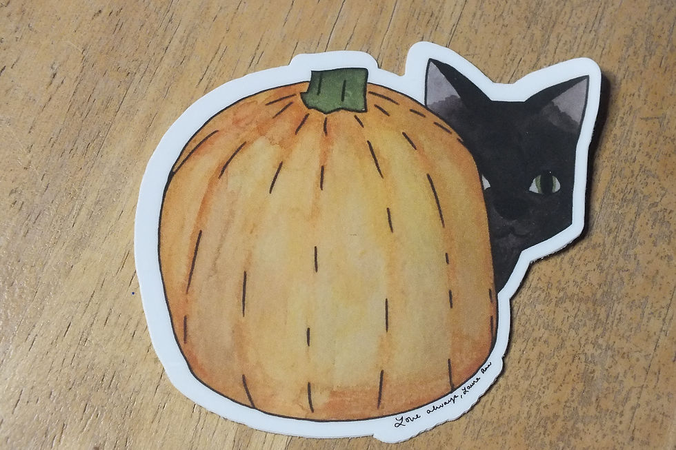 Black Cat with Pumpkin Sticker - Kitty Sticker - Large Cat Sticker
